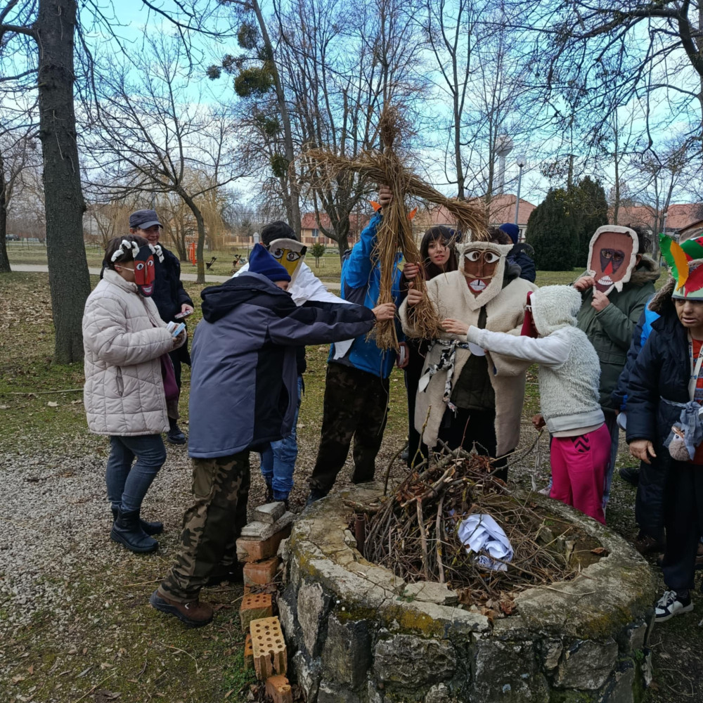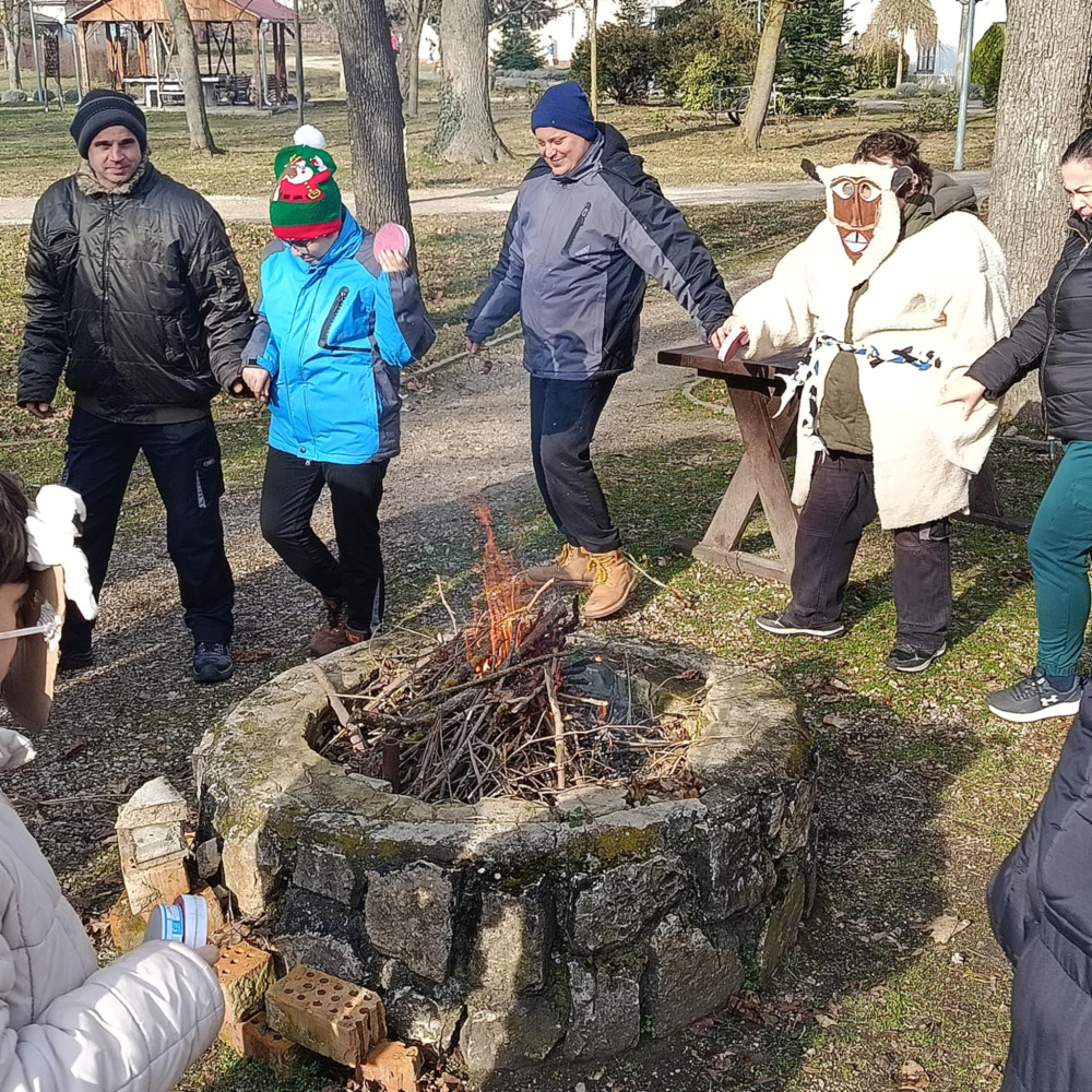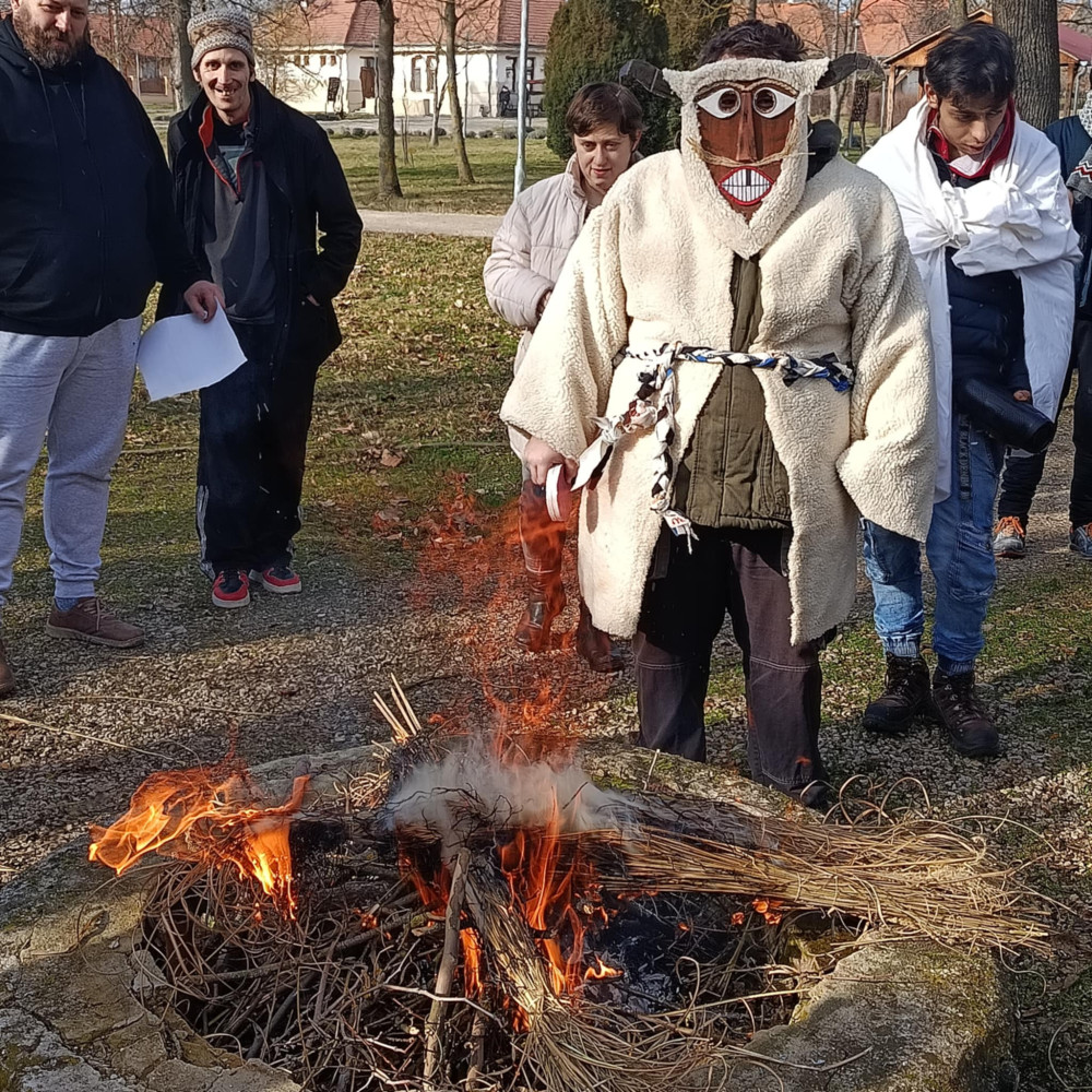 Intézményünkben a T-épület és az Új épület ellátottjaival busó jelmezekben érkeztünk az ünnepség helyszínére, ahol minden biztonsági előírás betartásával „máglyát” gyújtottunk. Lakóinkkal zajkeltő eszközökkel felszerelkezve körbetáncoltuk a tüzet, amely a megtisztulás és az újjászületés szimbóluma. A ritmusos mozgás, a közös éneklés, a tűz ropogása felszabadult hangulatot teremtett és egyben komplex érzékszervi tapasztalatot biztosított.