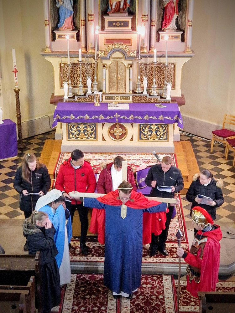 Ebben az évben ismét új előadással készültünk, melyet több hetes próba előzött meg. A hitéleti csoport 12 lelkes tagjával, Vassné Bakondi Katalin és Kedu József kollégáim segítségével tanultuk be a „Köszöntünk téged, győztes Áldozat!” című passiójátékot.