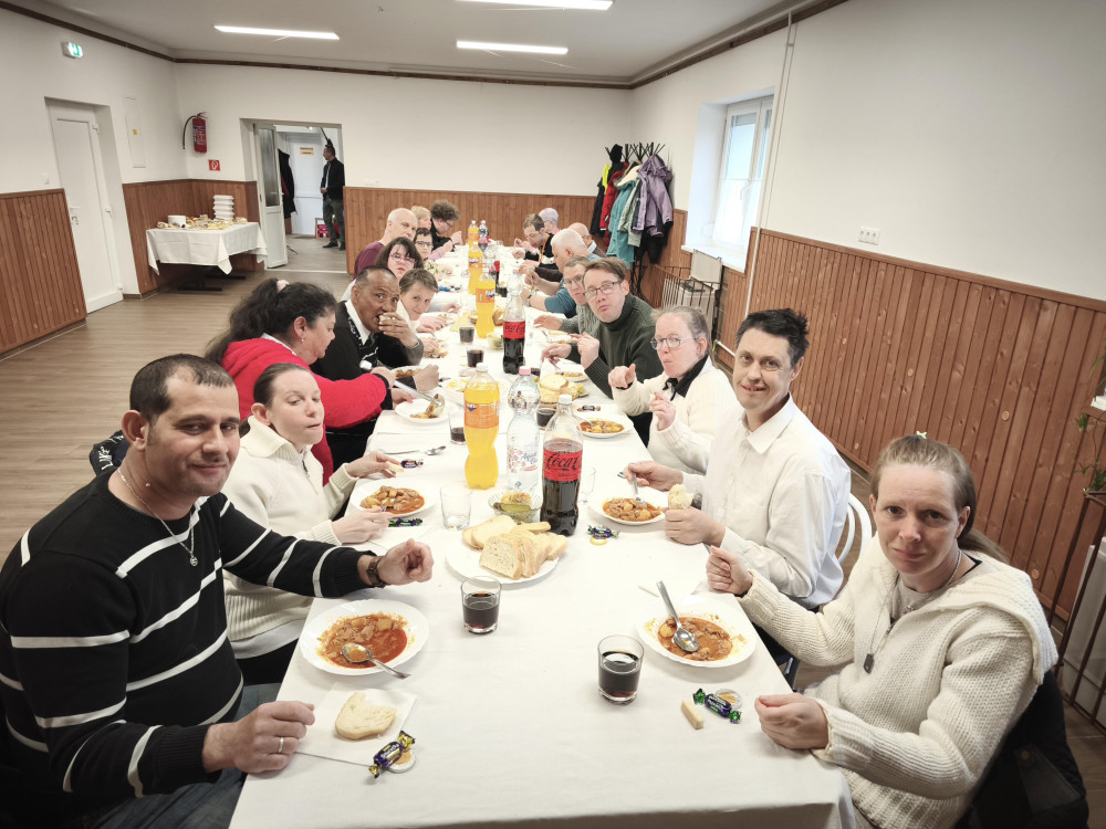 A műsor után a kultúrházban agapén fogadta csoportunkat Ede atya és az önkormányzat nevében Szilágyi Lajos polgármester. Finom, bőséges ebéd, és a falu asszonyai által készített sütemények vártak minket. Ezúton is köszönjük a vendéglátást házigazdáinknak!