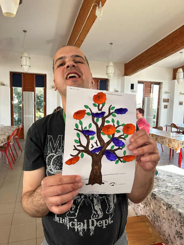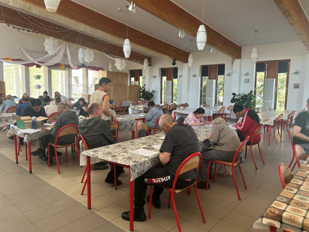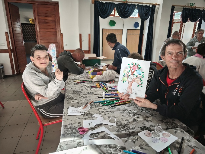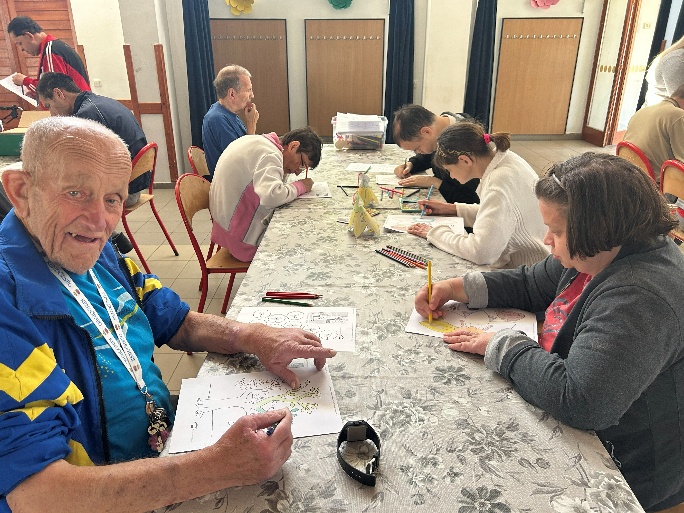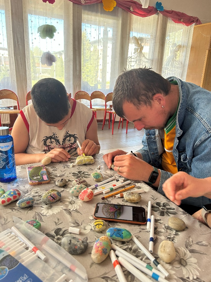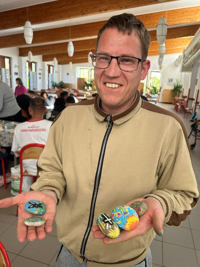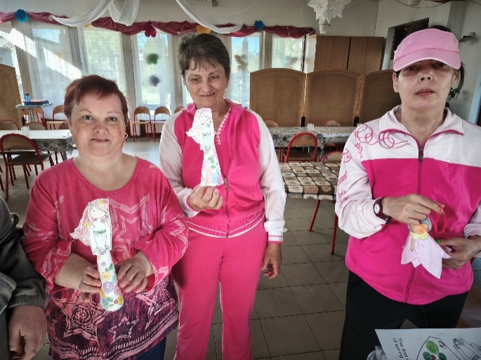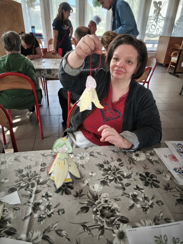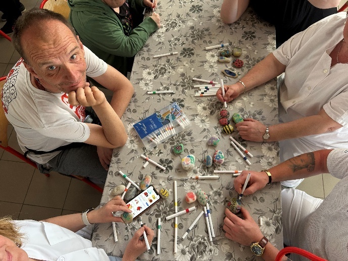 Az idei tavasz soron következő kézműves foglalkozását délután tartottuk meg az ellátottak étkezőjében. A foglalkozásra a tavasz várása adott témát. Háromféle díszt készíthettek a résztvevők, és kavicsot festhettek filccel, bármelyiket kiválaszthatták. Ez alkalommal is volt, aki teljes átéléssel, önállóan tevékenykedett, volt, aki segítséggel készítette el a saját alkotását. Összesen 53-an vettek részt a foglalkozáson, ahol színezhettek, vághattak, rajzolhattak, közben beszélgettek. Örömet adott számukra a közös élmény, az ellátottaknak különösen tetszett, hogy néhány dolgozó is aktívan beszállt a foglalkozásba és együtt alkothattak.