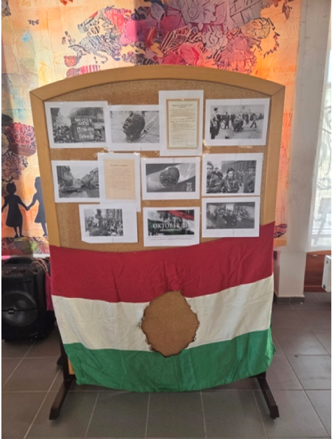 A forradalmi hangulatot a díszlettel, képekkel, zászlókkal, korhű jelmezekkel és zenei aláfestéssel tudtuk megteremteni és közel hozni a jelenünkhöz.