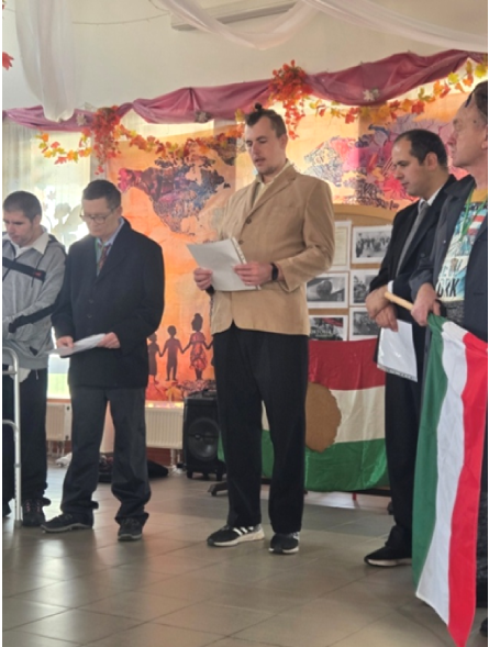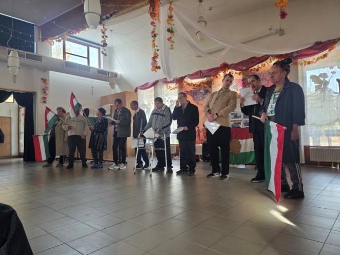 Október 23-án, a magyarság egyik legfontosabb történelmi emléknapján az 1956-os forradalom és szabadságharcra, az ’56-os hősökre és áldozatokra emlékeztünk, akik példát mutattak bátorságból és hazaszeretetből. A Himnusz után, rövid köszöntő beszédet követően hat ellátottunk elszavalta Márai Sándor: Mennyből az angyal című költeményét. Ezután egy ellátottunk mesélte el „Egy pesti srác történet-ét”, mely nagy hatással volt a hallgatóságra. Néhány percre átérezhettük a budapesti forradalmi hangulatot. Majd a „Ha én rózsa volnék” című dalt hallgathattuk meg néhány ellátottunk előadásában. Műsorunkat a Szózat közös meghallgatásával zártuk.