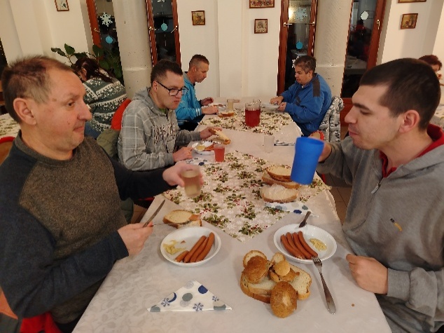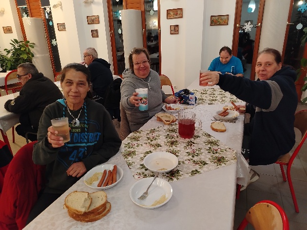 Az év utolsó napján december 31-én ellátottaink egy fergeteges hangulatú diszkóval zárták a 2025-ös évet, és köszöntötték az Új évet. Az óév búcsúztatása folytatódott az ünnepi vacsorával, a megterített asztallal, a hagyományos szilveszteri étel, a virsli elfogyasztásával, és az alkoholmentes pezsgős koccintással.