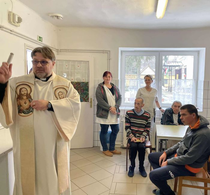 A liturgiát házszenteléssel fejezte be László atya, amit az osztályokon, illetve az irodákban is, elvégzett. Az osztályokon a mozgásukban korlátozott ellátottjainkkal külön is imádkoztunk, énekeltünk, majd megáldotta az osztályainkat, illetve az iroda helységeket. Így az adott helységek ház szentelésben részesültek, az ajtó szárfára felkerült a jelképes megszentelt matrica, közben pedig az ott lakók énekelték a Mennyből az angyalt.