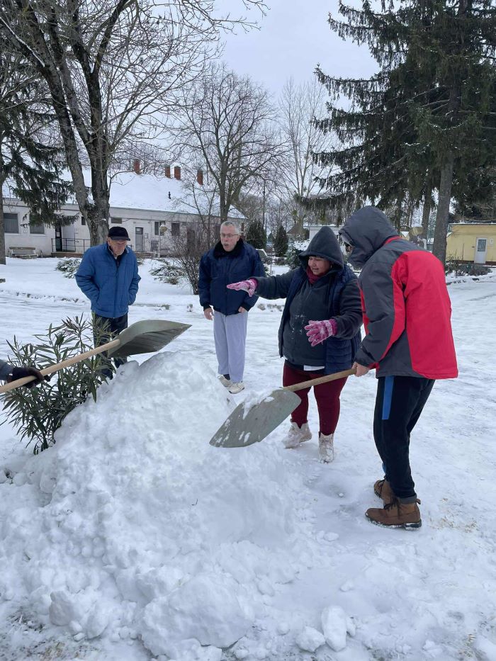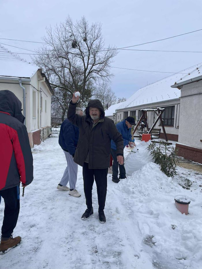Az ellátottjaink izgatottan várták az előre jelzett, és rég nem látott havazást. 2026. 01. 06-án rendkívüli programot iktattunk be, hiszen végre a napokban annyi hó esett, hogy a téli örömöket tudtuk már élvezni. Az intézmény parkjában tettünk kisebb sétákat, és volt olyan ellátottunk, aki gyermekkorát visszaidézve hóember építésbe kezdett, amihez sokan csatlakoztak. Nagy örömüket lelték a hógolyózásban, hóember építésben, ami nem csak egy egyszerű foglalkozás volt, hanem közösség építő erővel is bírt.