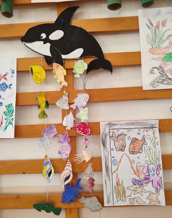 Lakóinkkal ezen a foglalkozáson a tengeri vízi élővilág változatosságára helyeztük a hangsúlyt és színes papírokból illusztráltunk többféle élőlényt. Az elkészült munkákat a fali újságra függesztettük ki.