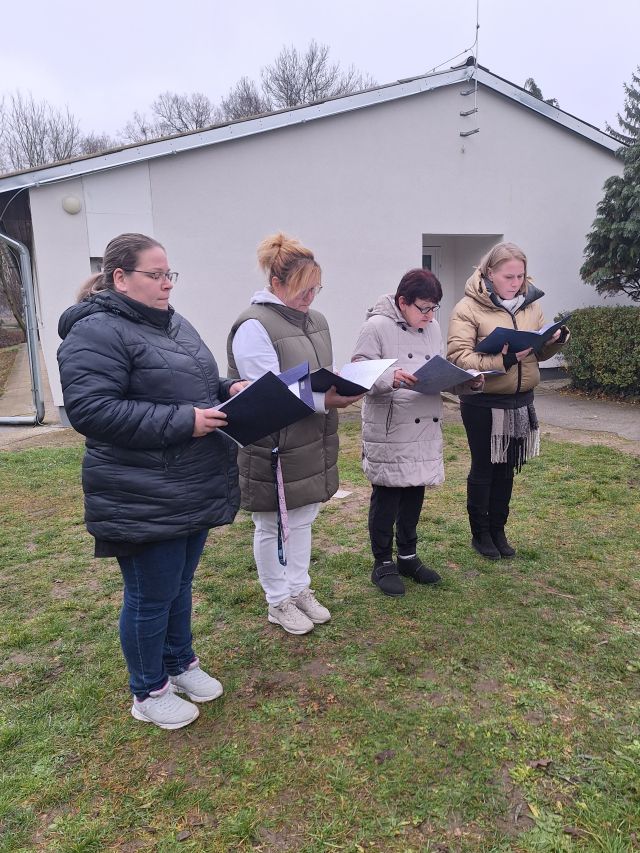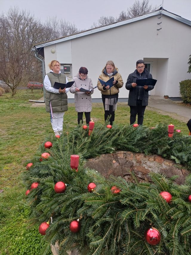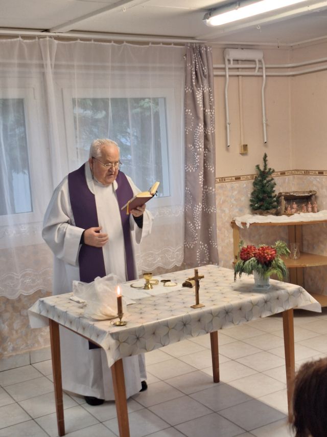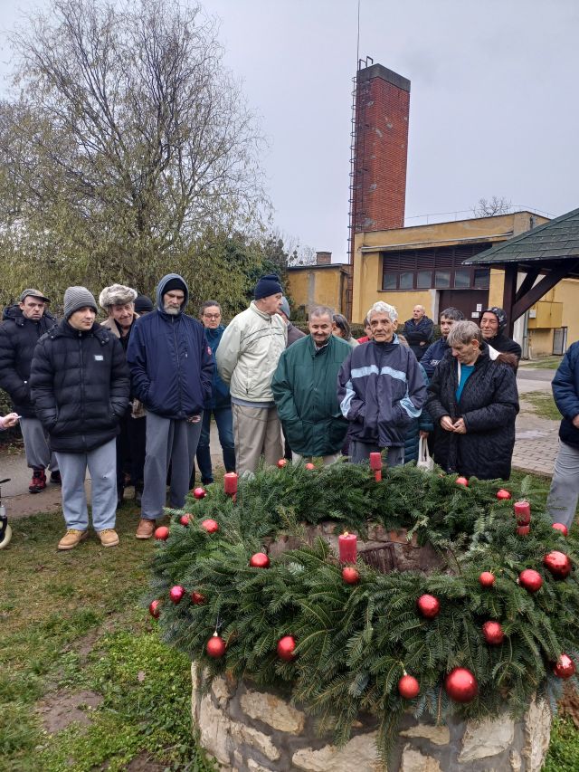 Ismét eltelt egy hét, egyre közelebb kerülünk Karácsony ünnepéhez. Bakos Frigyes Atya szentmisét tartott intézményünkben. Az elmúlt hetekhez hasonlóan ma is megtelt az étkező, többen el is végezték szentgyónásukat a mise előtt. Egyik női ellátottunk nagyon gyenge, hosszan tartó betegsége van, neki feladta szobájában Frigyes Atya a betegek kenetét. Ezután az udvaron meggyújtottuk a harmadik gyertyát a műsort követően.