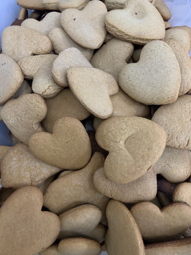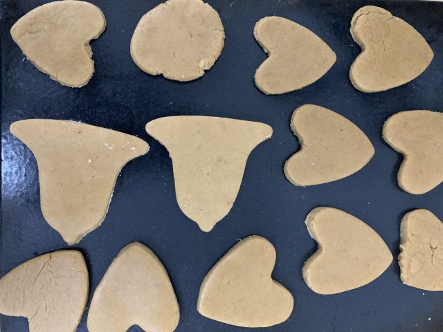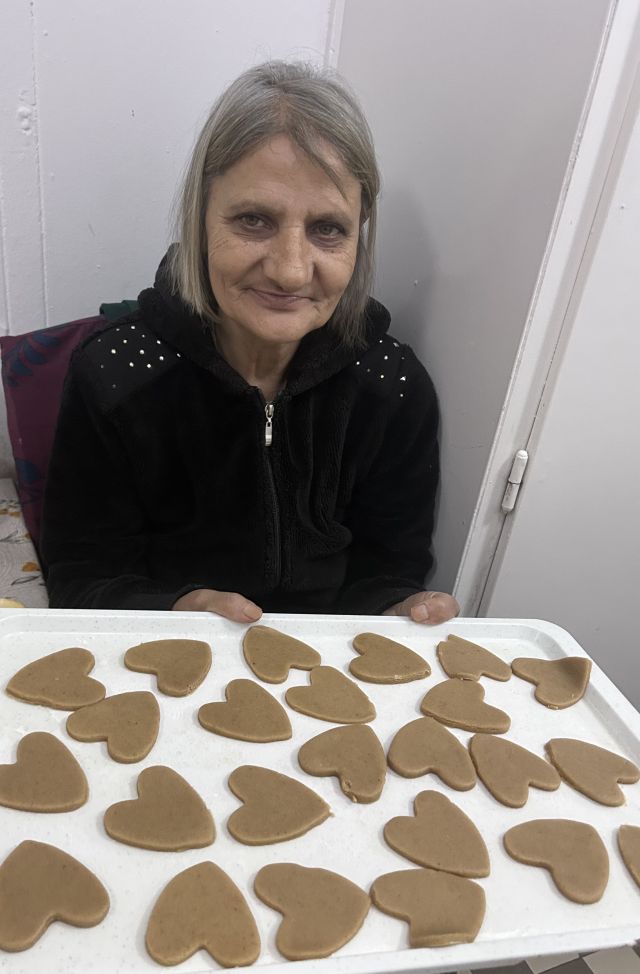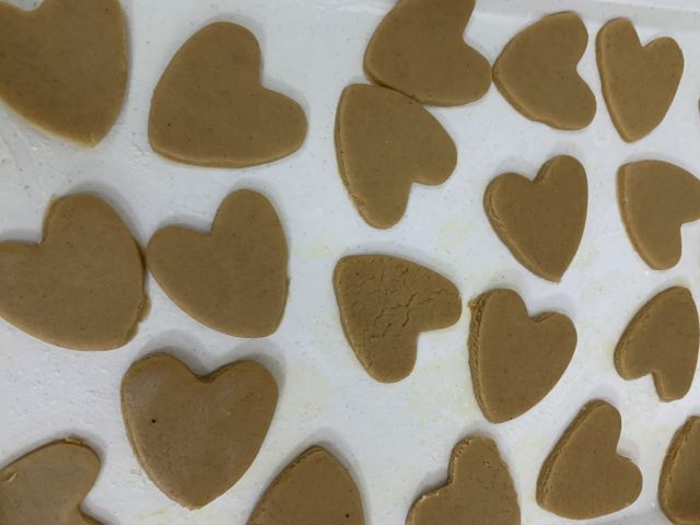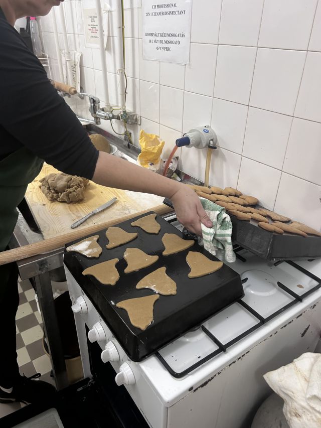 A hagyományokhoz híven az idén is sütöttünk mézes kalácsot. Ellátottjainkkal összeállítottuk  a tésztát, amit egy éjszakára a hűtőbe tettünk pihentetni. A fahéj, a szegfűszeg, a méz illatára gyülekeztek ellátottjaink, és még a nyers tésztát csipegettük, megfelelő lesz-e? Másnap álltunk neki a  tészta kinyújtásának, kiszaggatásának. Azt határoztuk el, az idén csak szív alakú formákat szaggatunk, mert a szívünk tele van az adventi várakozással. A mézeskalács sütése a legfontosabb mozzanat, mert ha megég, a méz  és a fűszerek megkeserednek. Egy ellátottunkat a sütővel szembe ültettük le, kineveztük őrszemnek, az a feladata volt, hogy el  ne égessük az édességet.